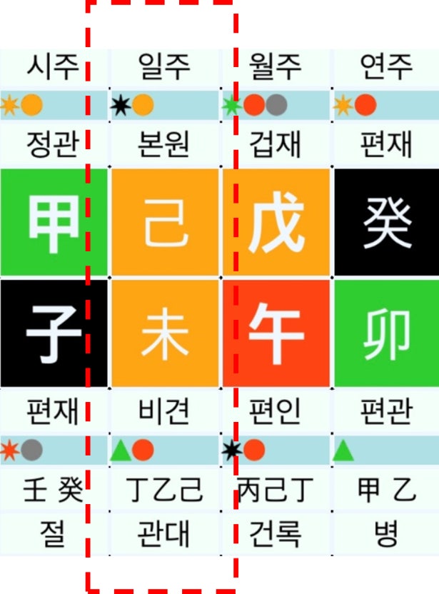 ** 이미지에서 일간은 '기(己)', 일지는 '미(未)', 그래서 일주는 '기미(己未)'입니다.