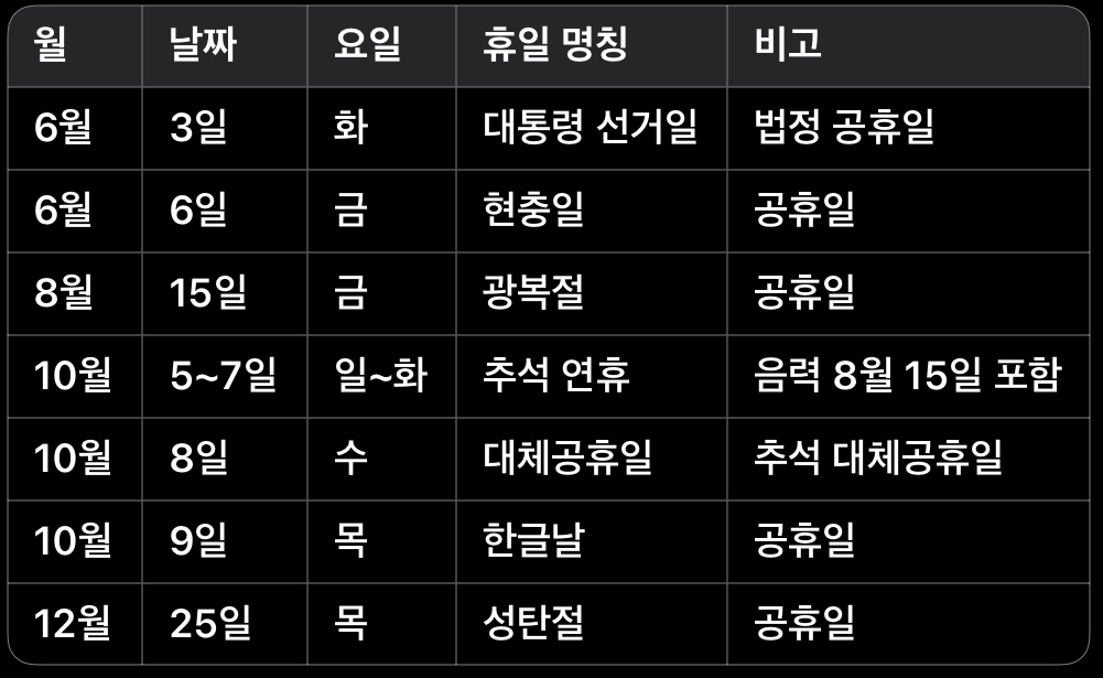 • 8월 14일(목): 연차 1일 → 광복절 포함 4일 연휴 구성 가능